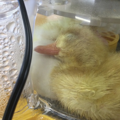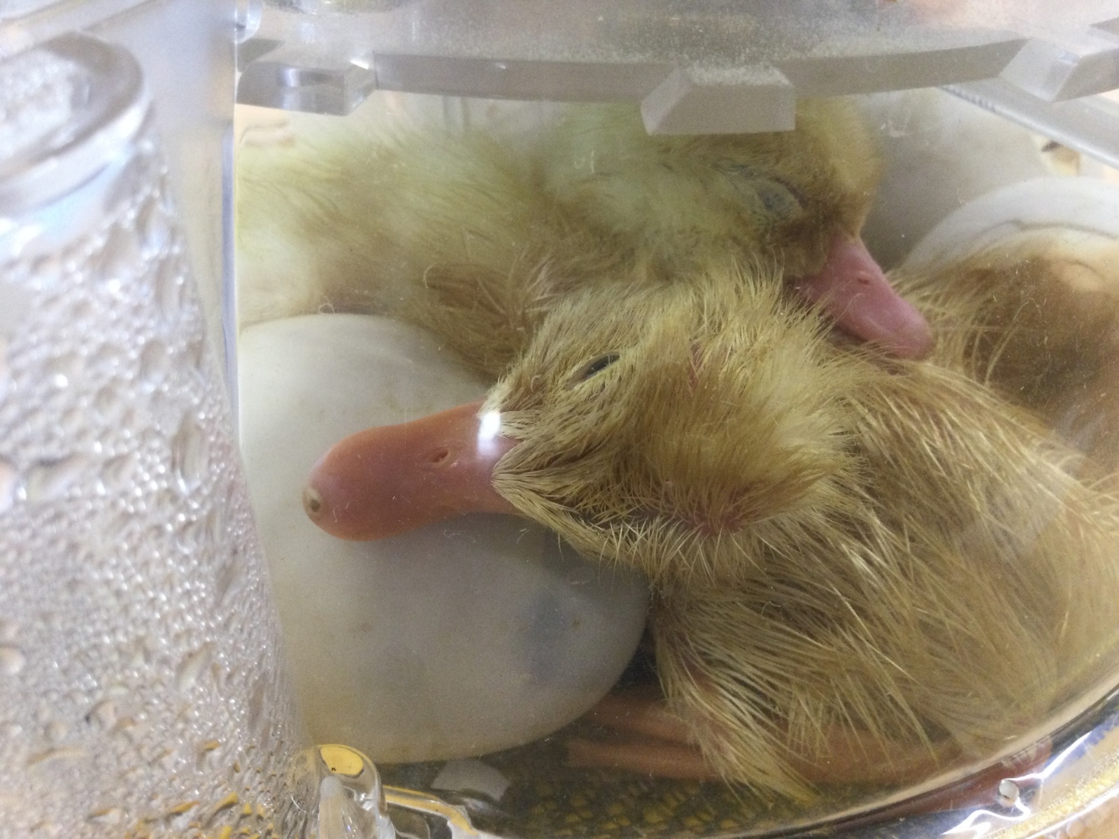 The ducklings are doing amazingly well. Right now, they are very tired, which makes sense considering how much effort it takes to hatch out of an egg! They’re snuggling up and trying to sleep, while one final egg continues to wiggle and crack. We’re all excited to see if another duckling joins us soon.