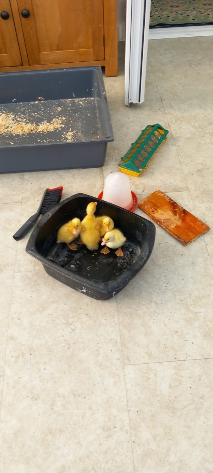 All four ducklings are now together in the cage, getting used to their cosy new surroundings. After giving their area a quick clean, we made sure they had plenty to eat. Then came the best part: we carefully let them out for a short explore! The ducklings waddled around, stretching their tiny legs and checking out their environment with lots of curiosity.
