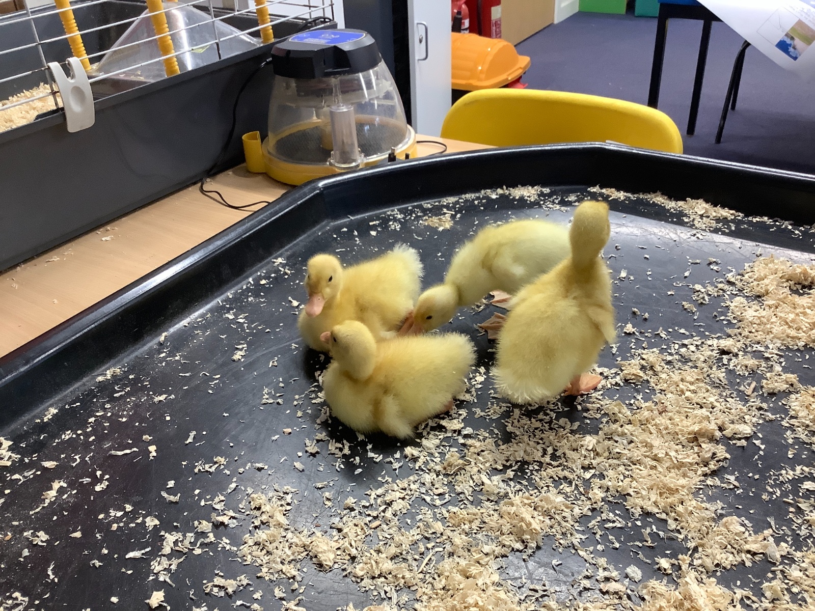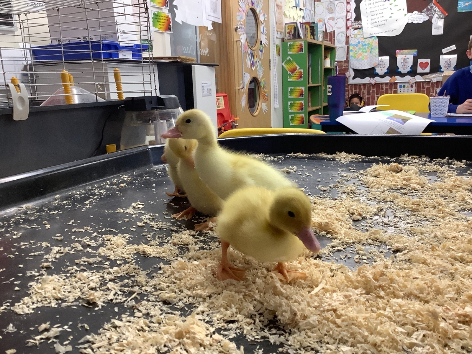 Before the students arrived on Day 7, I gave the cage a good clean and allowed the ducks to have a little run around the classroom. They waddled happily from table to table, clearly enjoying their early‑morning freedom.